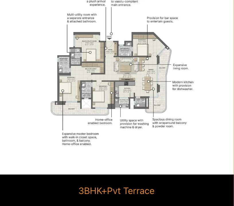 3 BHK + MU Room + Private Terrace 3399 - 3537 Sq. Ft. On Request
